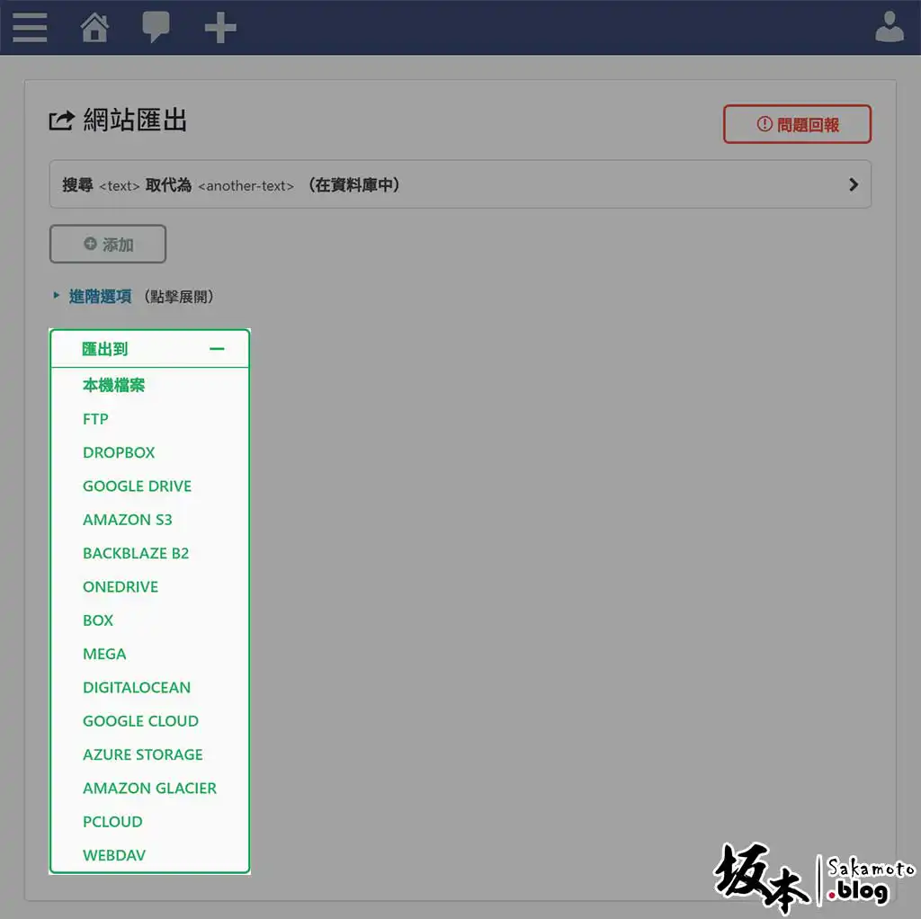 在左側選All-in-One WP Migration→匯出的管理頁面,點選 匯出到 的按鈕,或可另選進階選頁來個別要備份或不要備份的項目。