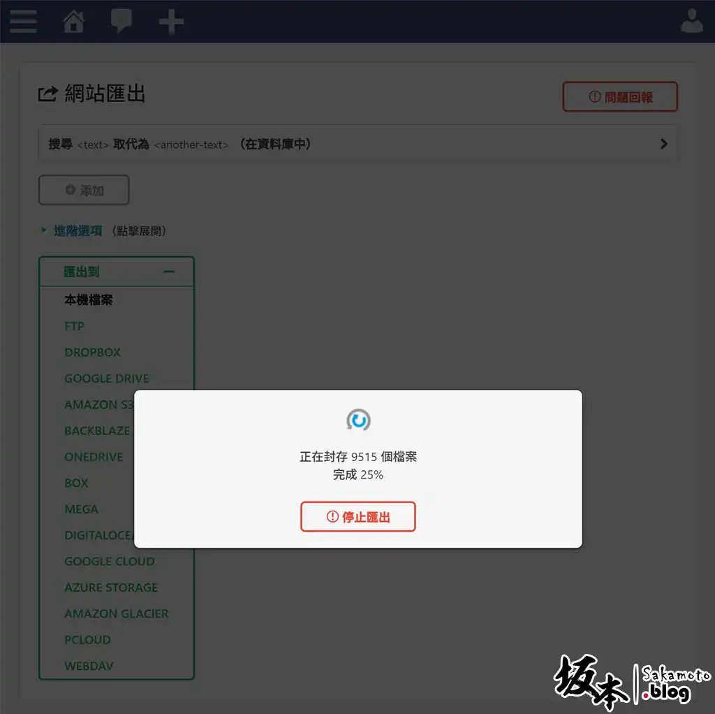 就會看到正在打包備份中,在這段時間期間,先不要有任何動作 (事前請先關站再備份),在之後會顯示 DOWNLOAD sakamoto.blog 完成備份了。