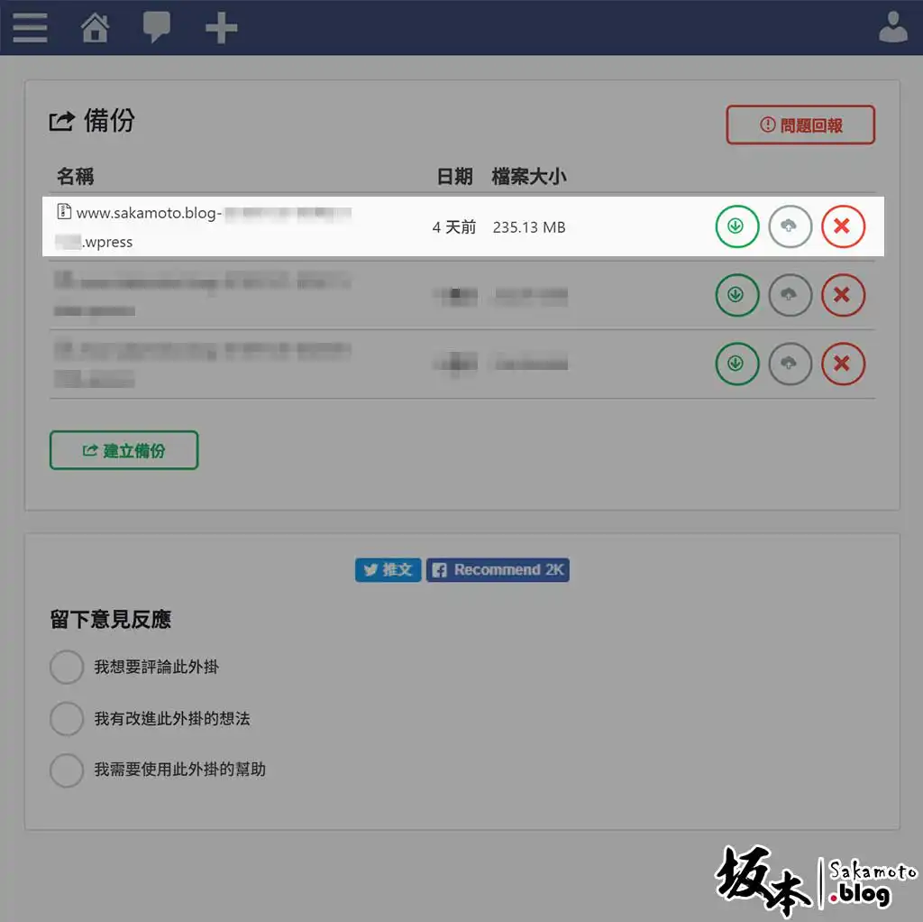 當打包備份完後,在備份選單裡,可看到一列表,有顯示備份時間、備份大小,就不怕弄錯,除了之外,也能下載、還原或刪除的檔案都可以唷~