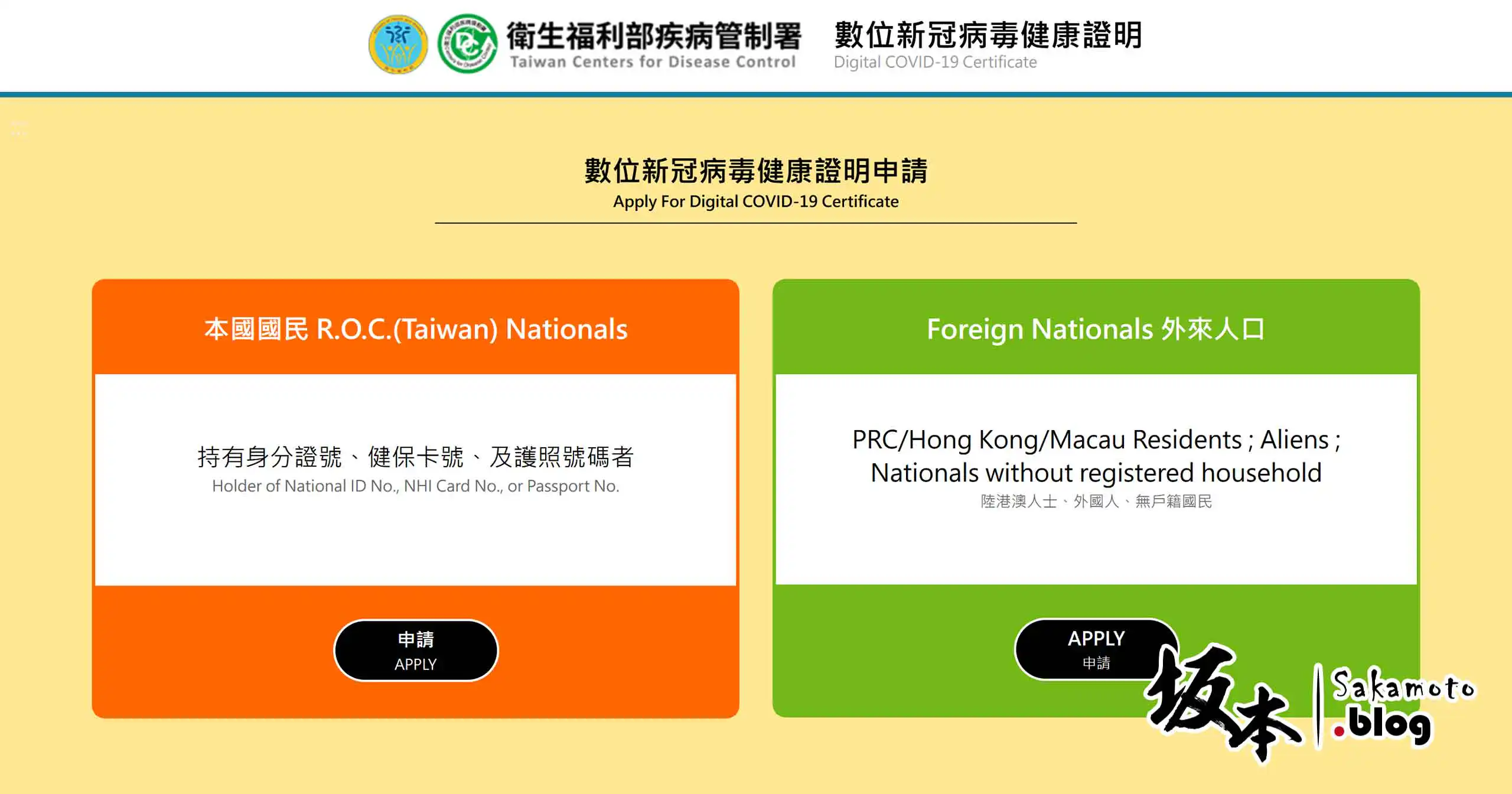 首先,上到「數位新冠病毒健康證明申請」平台 ( https://dvc.mohw.gov.tw/ ) 申請,依照你自己申請身分點選 申請 Apply 進入。