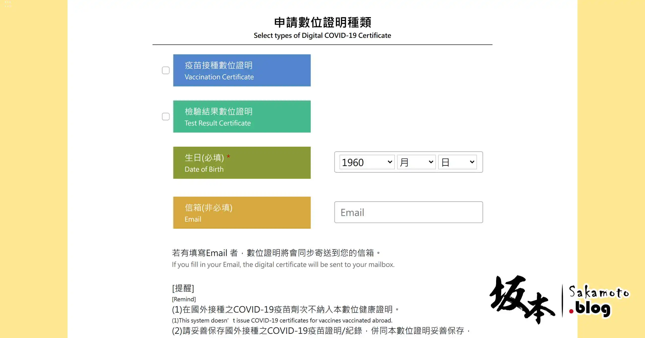 申請數位證明種類依你需要那些證明,不過除了申請「疫苗接種數位證明」之外,因為出國還要1~3日的「檢驗結果數位證明」,所以建議勾選二個,接著下面要輸入生日驗證,然後信箱會寄到 Email 裡備存一份的檔案,就按 下一步 去。