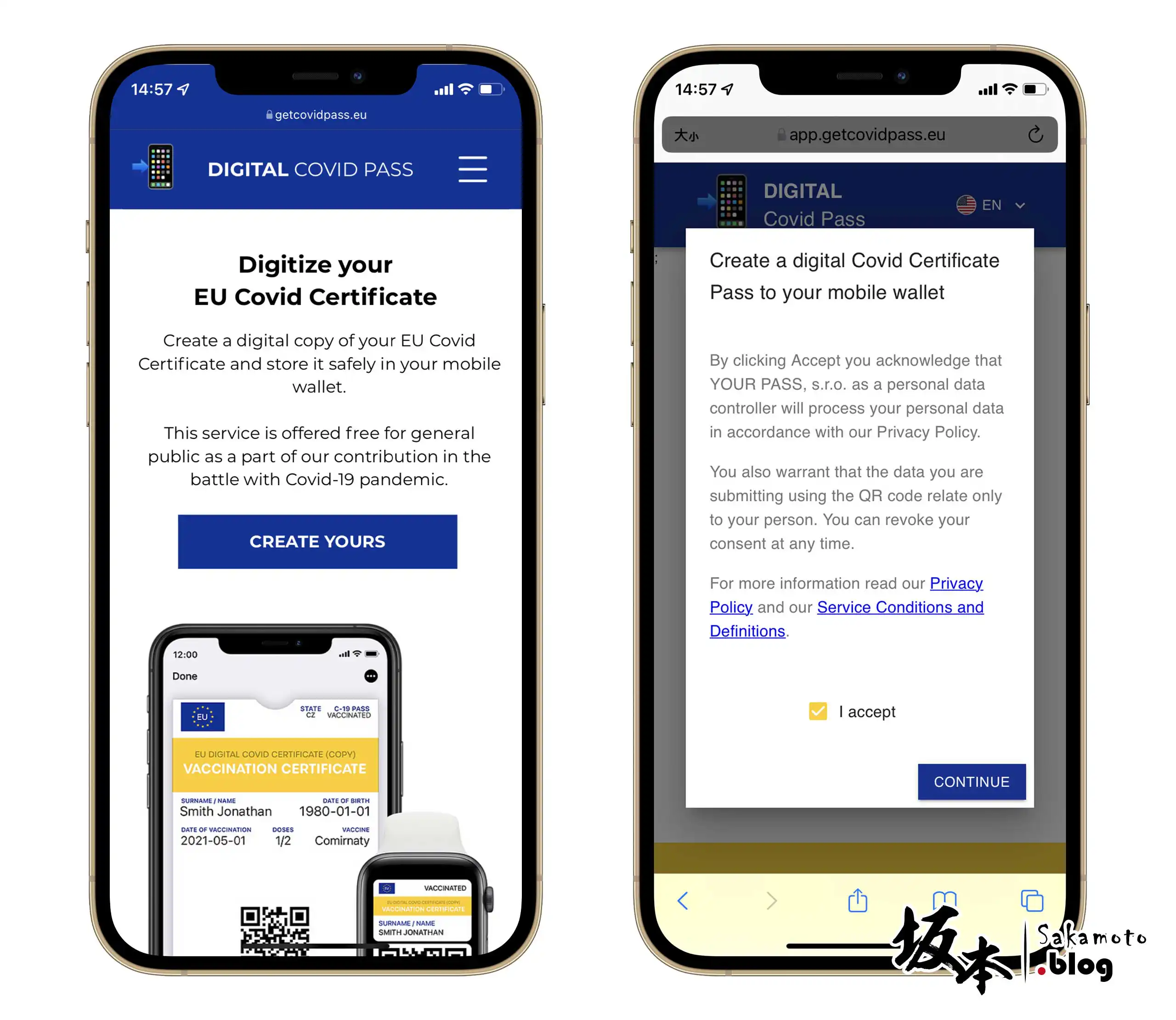 首先,拿出手機前往歐盟提供 DIGITAL Covid Pass 平台 ( https://app.getcovidpass.eu/ ) 頁面,點選 CREATE YOURS 按鈕,會跳出一些聲明宣告書,然後再勾選 I accept 並且按下 CONTINUE 進入。