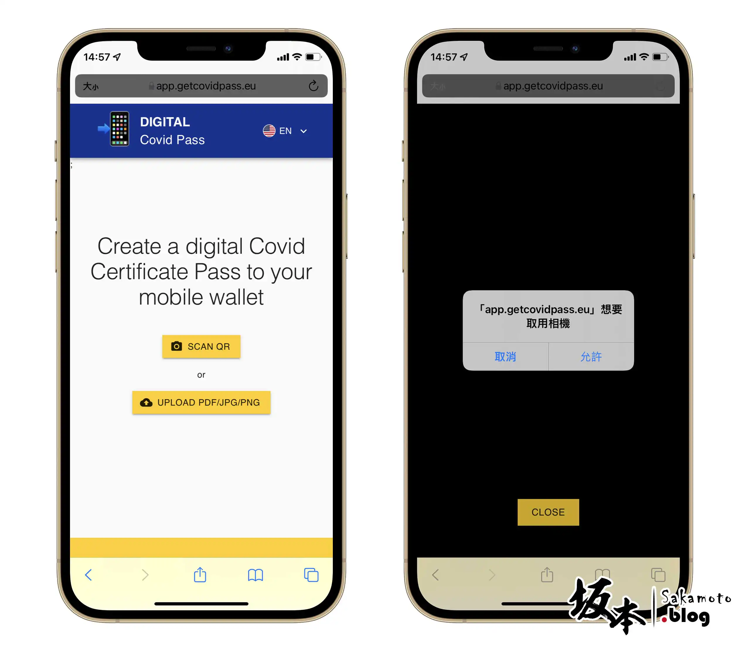 掃瞄方式有二種分別為 SCAN QR ( 掃瞄 QR ) 或 UPLOAD PDF/JPG/PNG ( 上傳檔案 ) 可選擇,選擇 SCAN QR 按鈕進去相機模式,它會要求你是否允許使用相機,點選 允許 就可拍照 QRCode 掃瞄了。