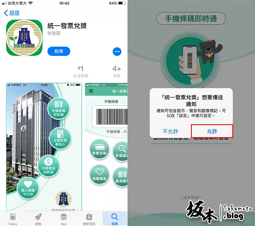 依 iOS 操作方式,在 Store 搜尋輸入 統一發票兌票 ,找到後點擊它下載並且安裝,安裝完後開啟 App 時,會跟您需要權限才使用通知,按下 允許 鍵。