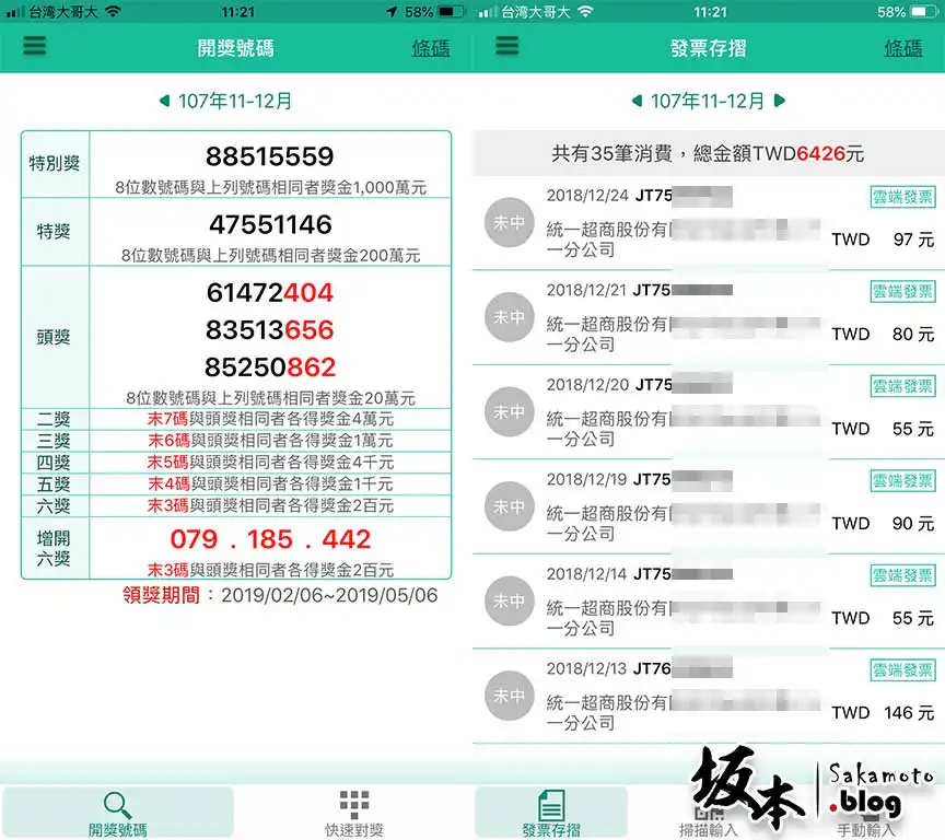 手上有紙本的話,可看開獎號碼;若是載具裡的話,它會幫您自動對獎,都有顯示 未中 跟 已中 圖示,是不是很方便嗎?