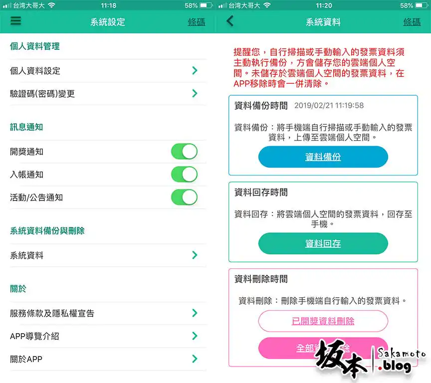 我想不用說,都是常見基本設定,依個人喜好設定,除了之外,還多出系統料備份與刪除,這個很方便,您手機沒有網路的話,一樣可使用手機條碼把發票存入,回到家後開 WiFi 網路,就把資料上傳至雲端裡也OK唷~