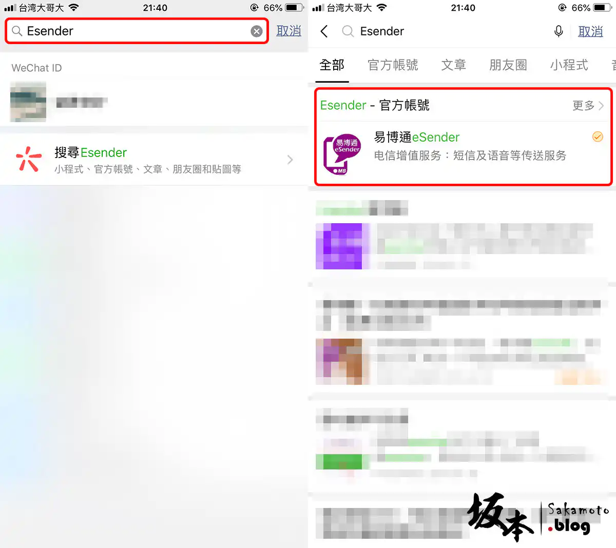 在 WeChat 的 搜一搜 功能,搜尋 eSender ,找到官方帳號後點擊它