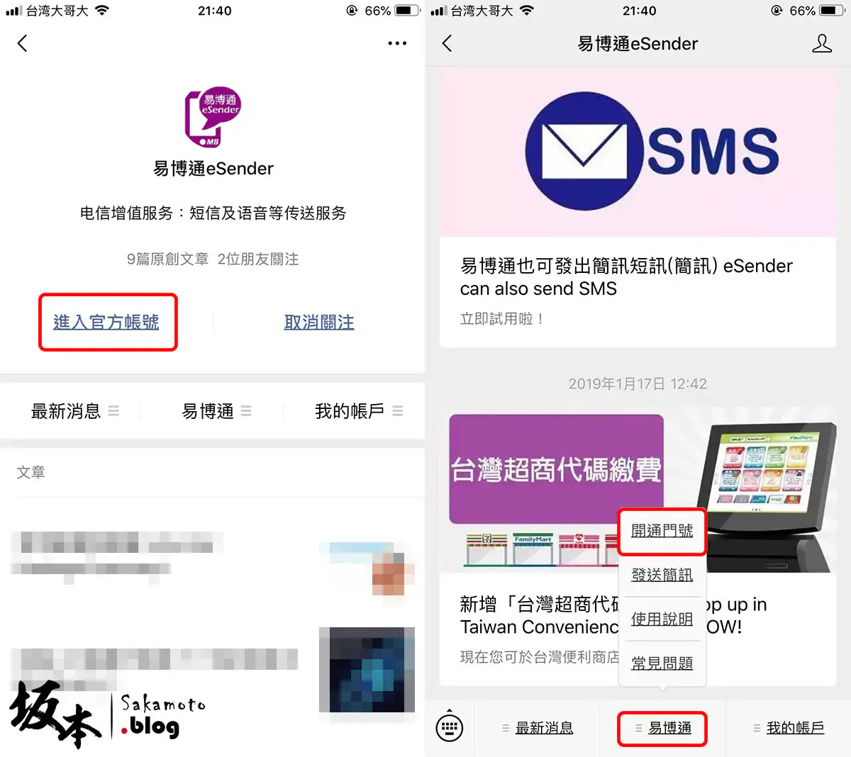 再點選 關注關官方帳號 而 進入官方帳號 ,最下方選 易博通 → 開通門號 進入