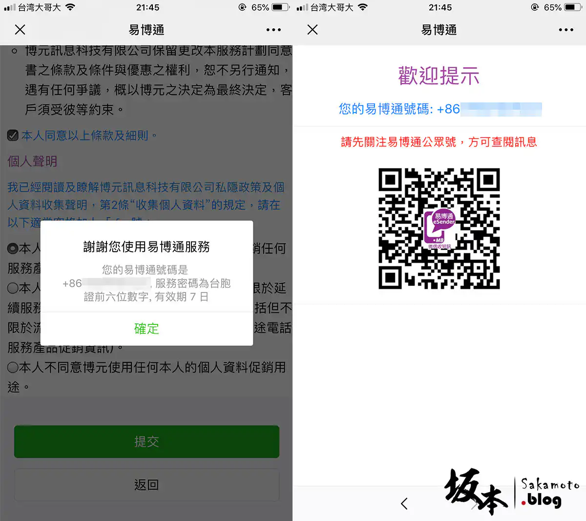 就直接同意條款送出,會給再一次提醒您的號碼,也是中國手機門號的號碼,請務必記下來。