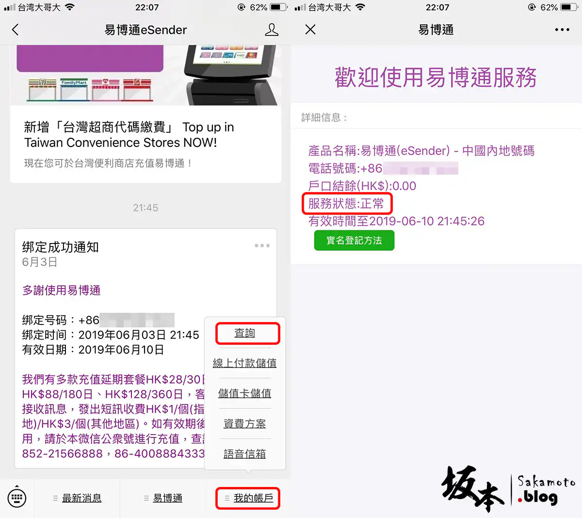 會秀出綁定成功通知,在下方選 我的帳戶 → 查詢 ,在服務狀態確認是 正常 囉,就可以接收簡訊~