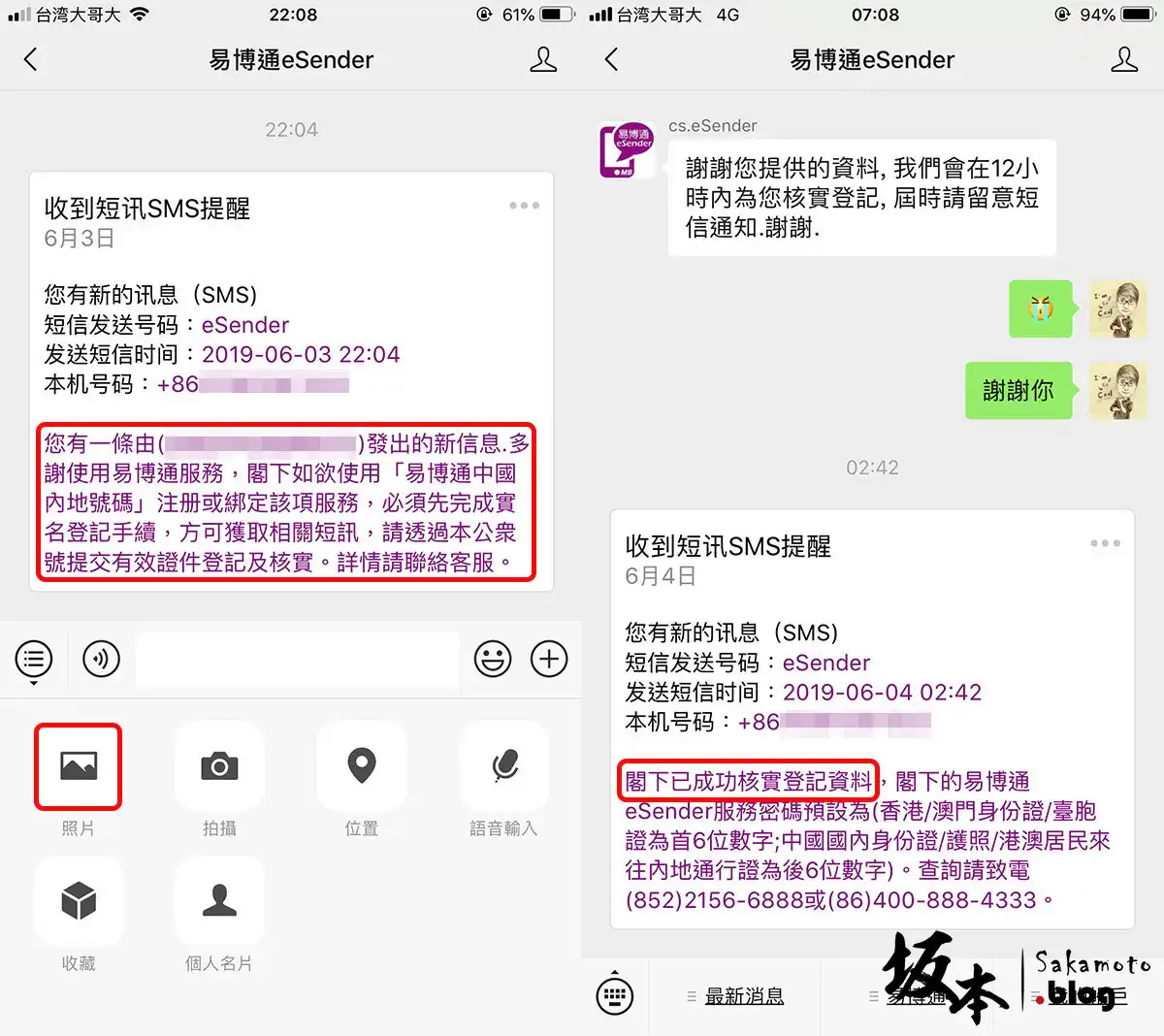 然後,不是每一家可看簡訊內容,可能是因為需要實名制認證關係,所以必須需提供一張自拍現場正面照及登記文件 (如:台胞證正面就好) 上傳給客服進行審核登記,進行審核登記並且12小時內通知您,就可以正常從可看到簡訊內容。