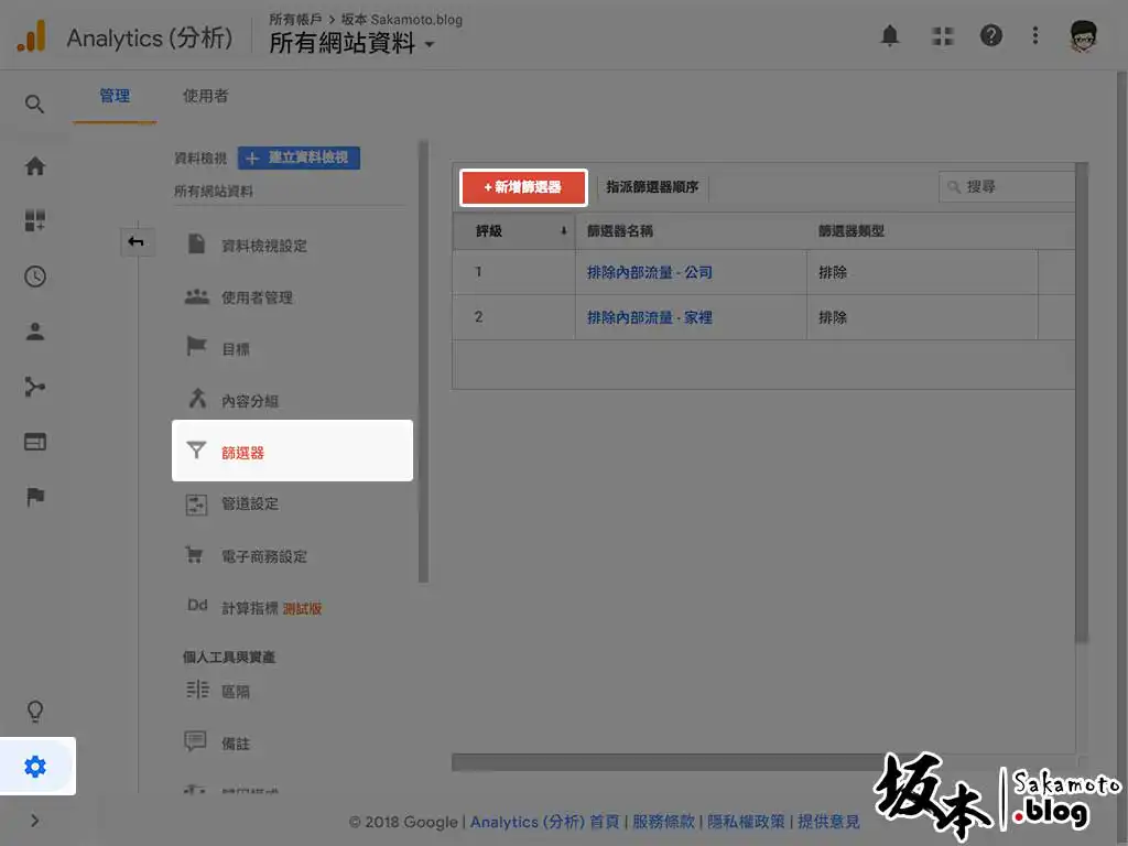 在 Google Analytics 頁面,設定 → 資料檢視「篩選器」→ 點選「+新增篩選器」進入。