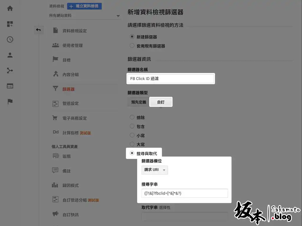 - 篩選器欄位:請求 URI,搜尋字串加入 ([?|&]?fbclid=[^&]*&?);取代字串欄位留空白 (不填)