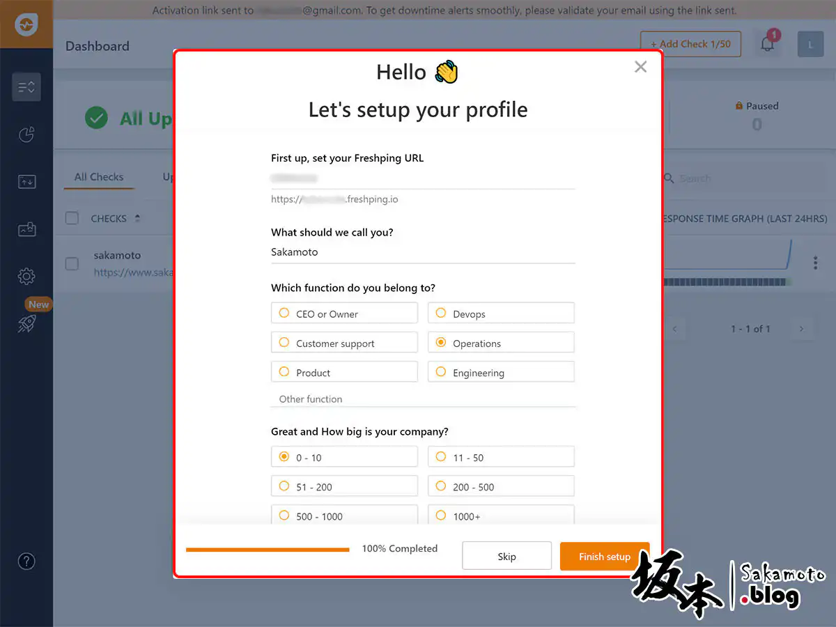 在 freshping 主頁 ( https://www.freshworks.com/website-monitoring/ ) ,有看到左側地方,輸入您的監控網站網址、電子信箱註冊完後,記得去收信您的驗證帳戶。