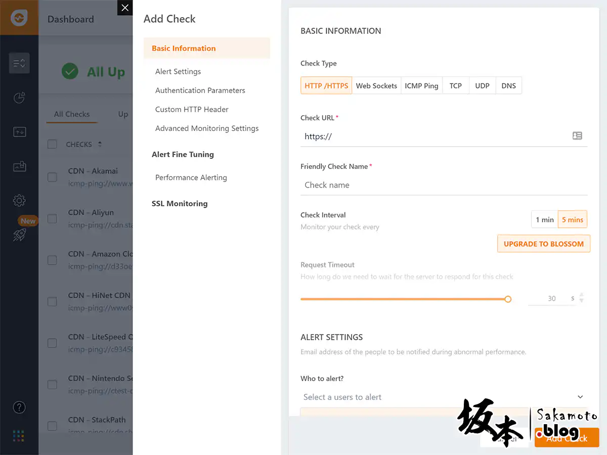 填完後,在系統頁面,右上角點選 + Add Check 來加入您要監控網站登錄上去。