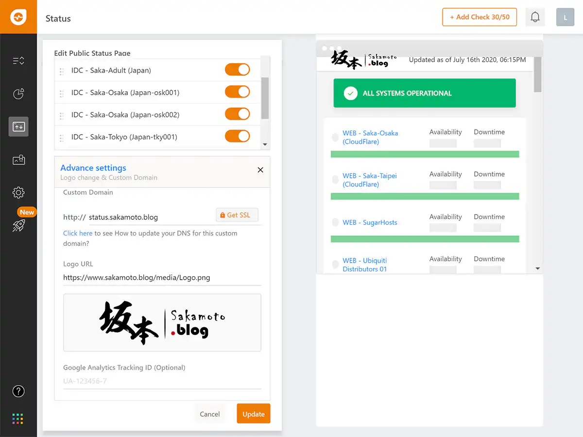 freshping 有提供對外的狀態自訂頁面,還可以分類不同的頁面對應 Public Status Page 特定列表出來,能調整順序列表以及開關是否顯示;Advance Settings 部分,可以自訂自已的網域指向 CNAME 這頁面,也能客製化 Logo 圖,真的很方便。
