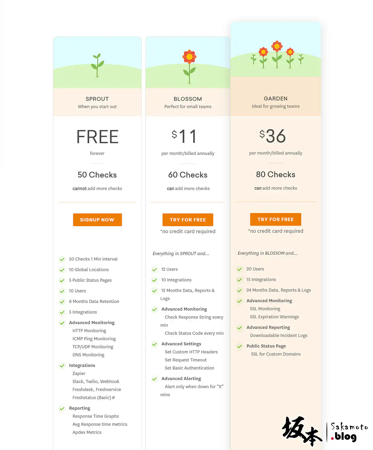 freshping 資費方案看得出來,它免費方案是非常很優勢,除了可登錄 50 個監測目錄網站之外,可以設定每隔 1~5 分鐘時間檢測、全球十個觀測點 (包括日本、新加坡站點) 以及對外開放狀態自訂頁面,也有提供加入10位管理者權限,最大好處的地方,付費方案是不需要信用卡綁定,可直接試用囉~