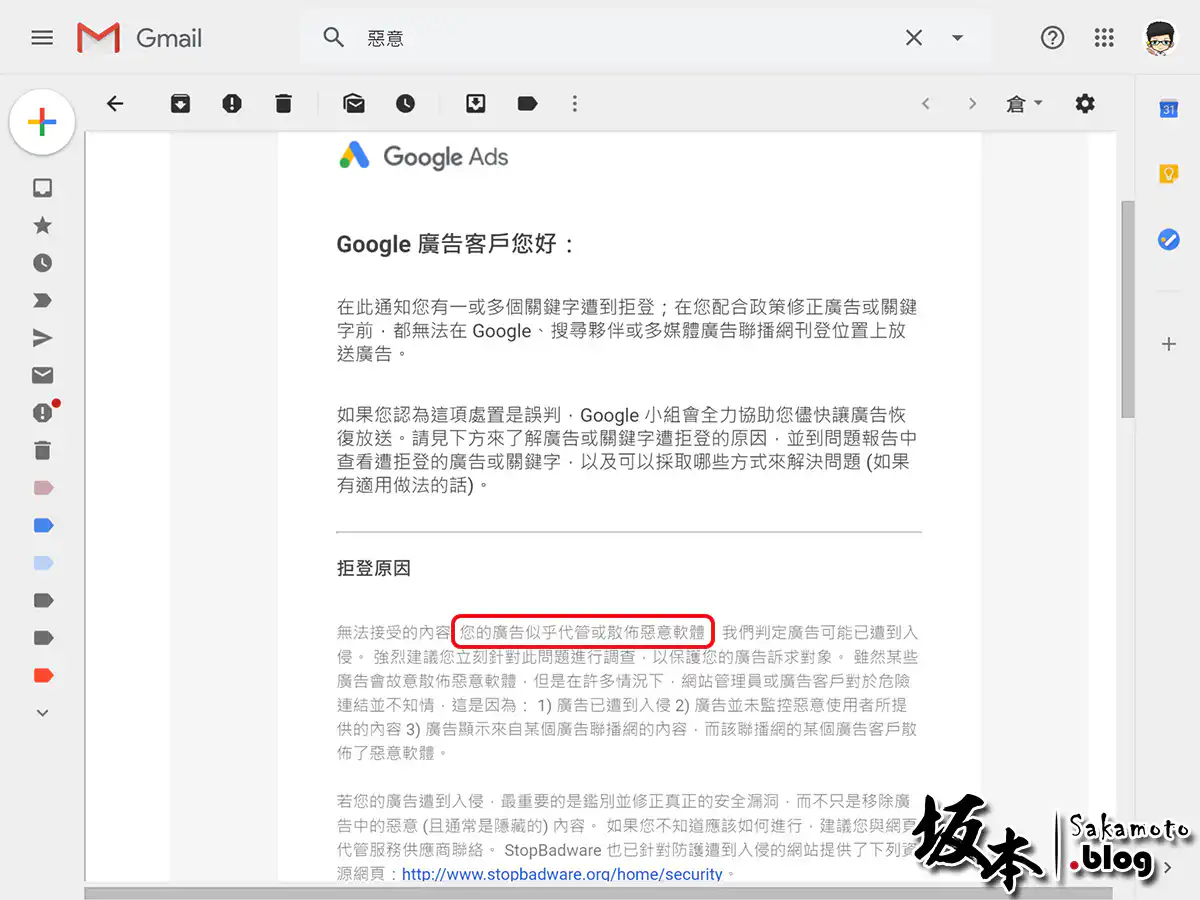 其實是這樣子,客戶收到一封信,Google 寫著是說廣告似乎代管或散佈惡意軟體,想說營運快三年了,從來一次沒有碰過這樣子情況,由於 Google Ads 判斷很奇怪的行為,大多誤判機率實在滿高,首先我分享這次罕見案例,希望有幫助到大家警惕一下。
