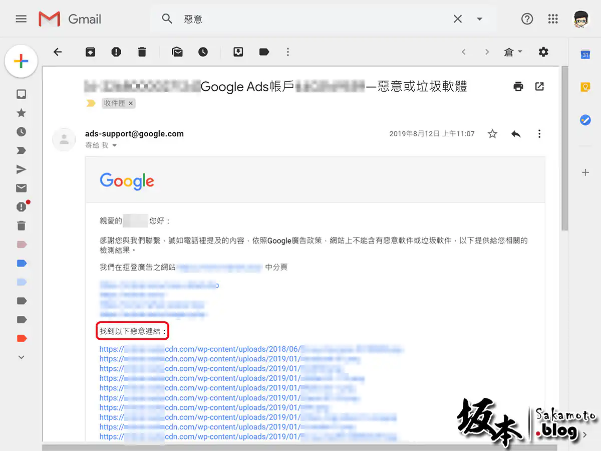 不知道大家有沒有發現到?若網址連結裡,只要沒有含 sakamoto.blog 字樣的話,就被判定惡意連結,真的很 … 有事也。