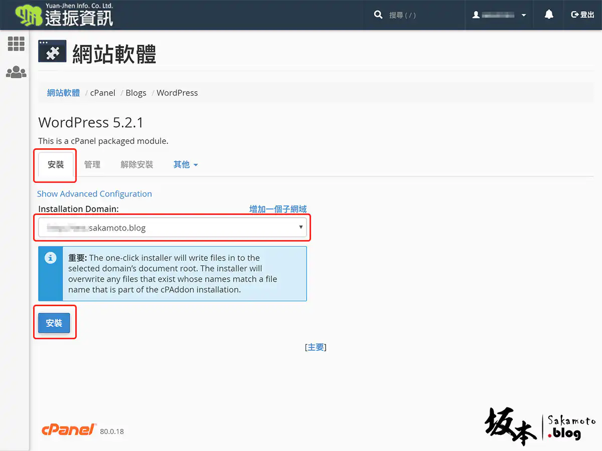 在安裝標籤裡,選擇網域要安裝 WordPress,若想自訂的話,可選 Show Advanced Configuration 自訂模式。