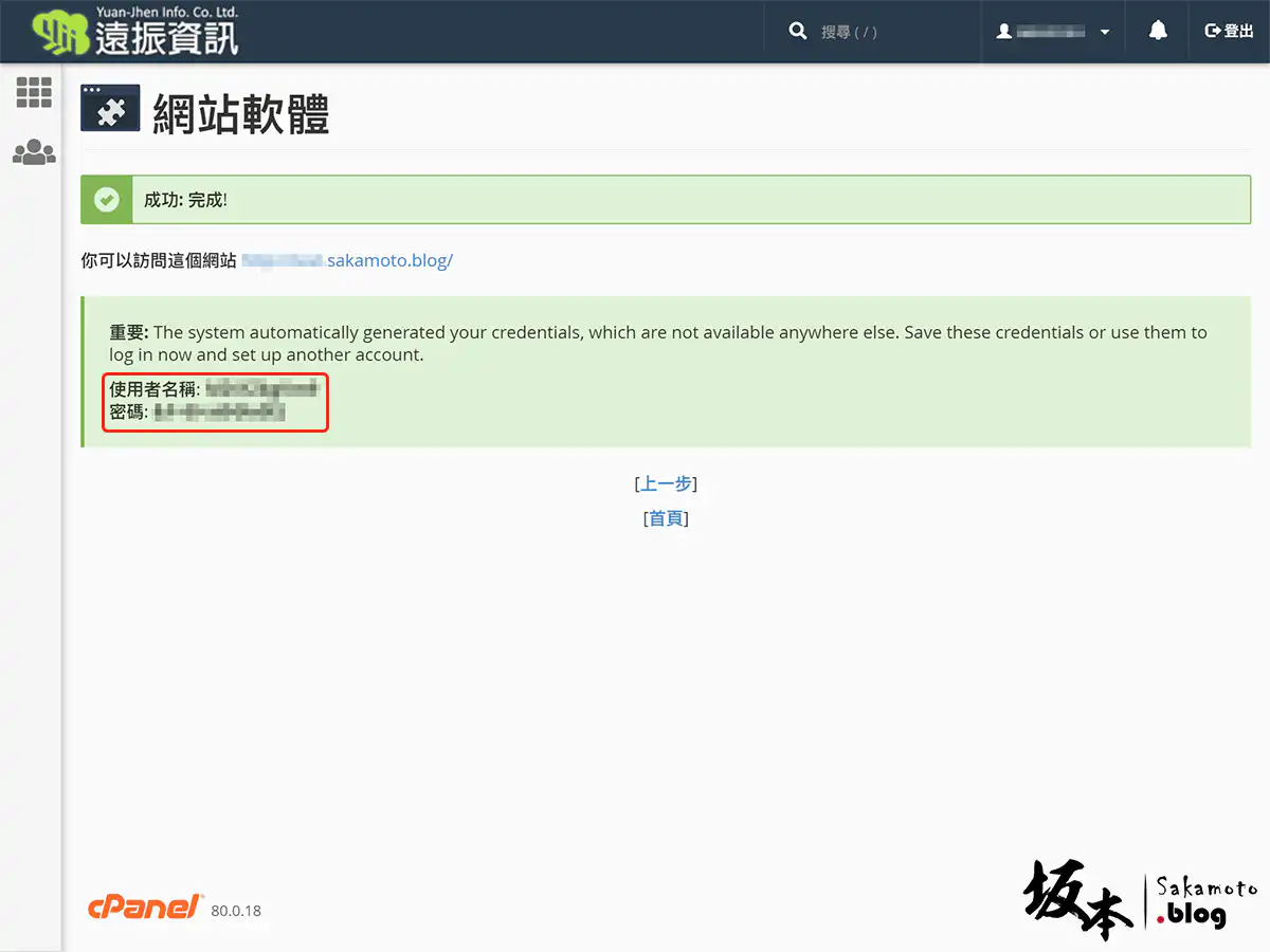 安裝完後,若是一鍵安裝的話,它會自動產生一組帳號密碼,也會寄到您註冊的 Email 裡面去。