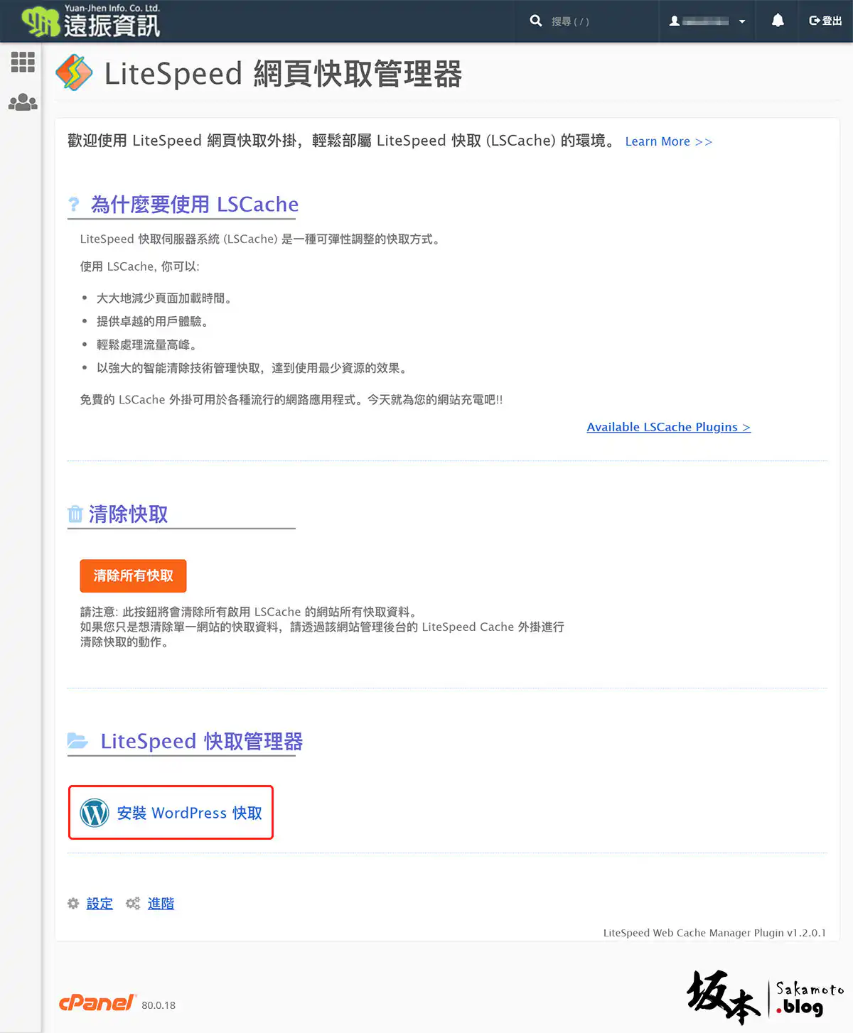 在 cPanel 後台看到 LiteSpeed Web Cache Manager 頁面,最下面點選 安裝 WordPress 快取 進入