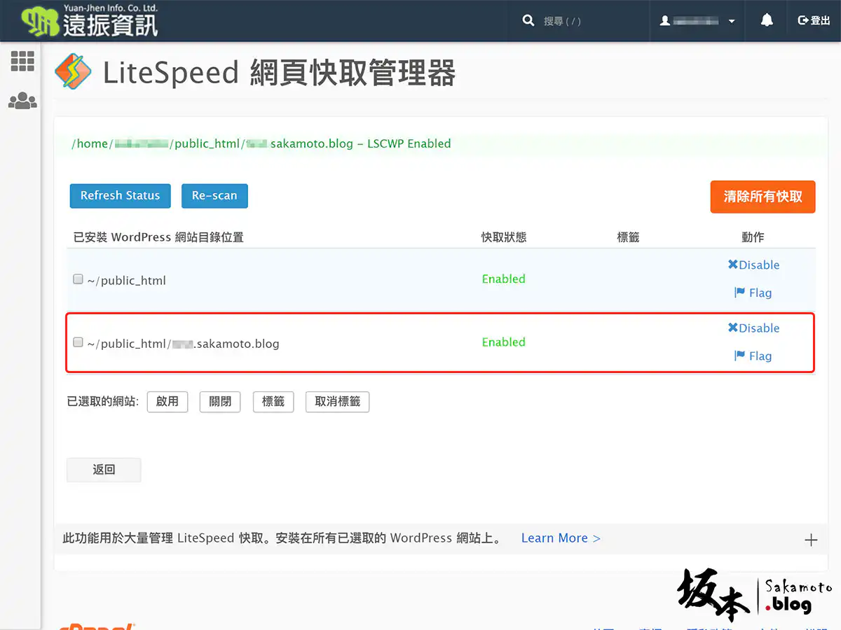 點選您要安裝的快取,點下 Enabled 啟動,需要時間完成安裝,就會看到上方顯示是 LSCWP Enabled 表示是您完成安裝上面。