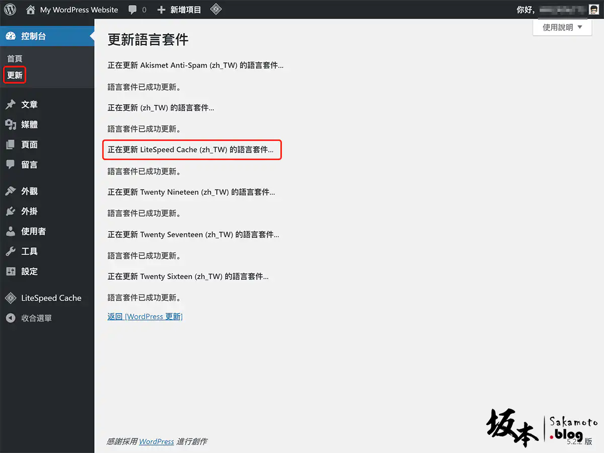 選好語言套用後,再去 更新 語言套件,就看到 LiteSpeed Cache 更新語言囉