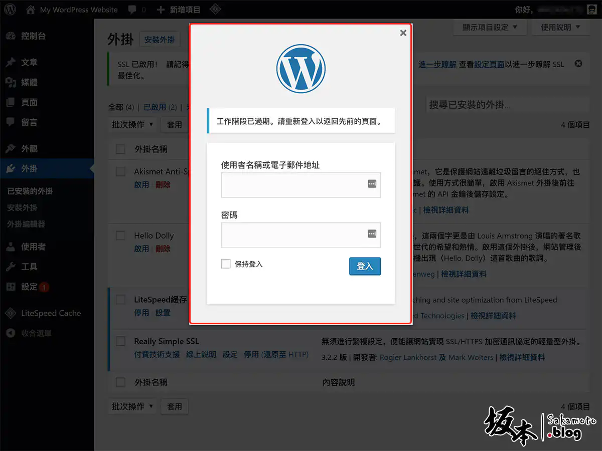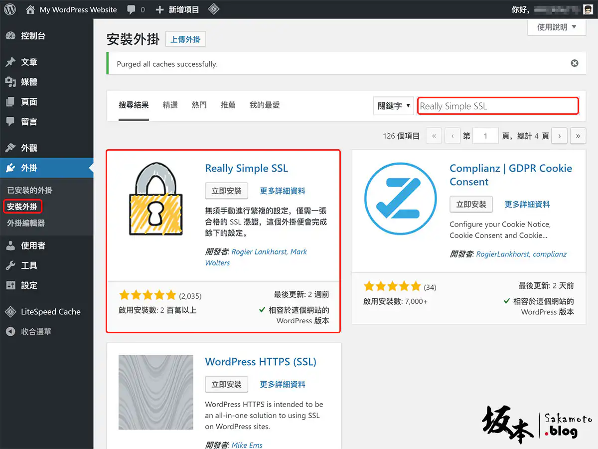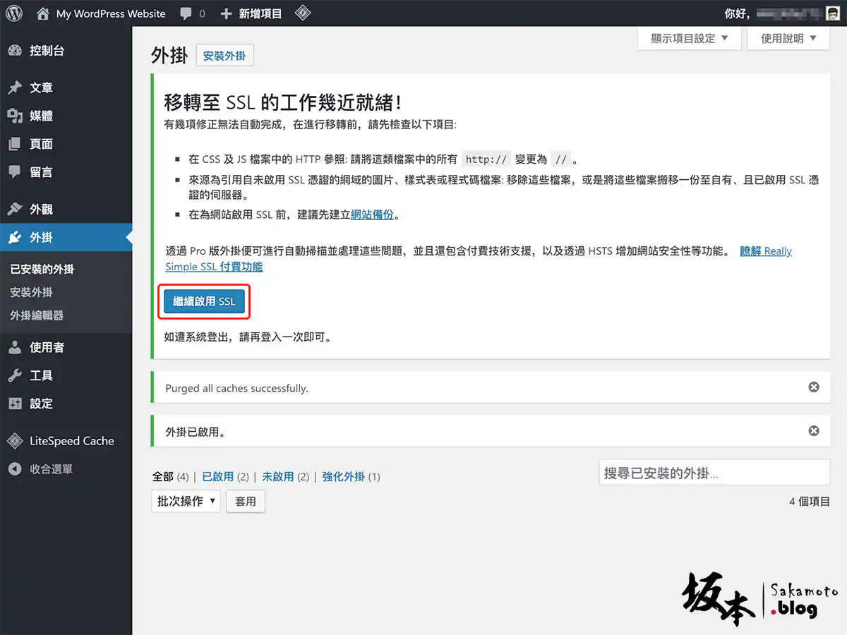 在之前先設定好 WordPress 301 重新導向 SSL,去安裝外掛 Really Simple SSL 套件後,並且啟用外掛套件。
