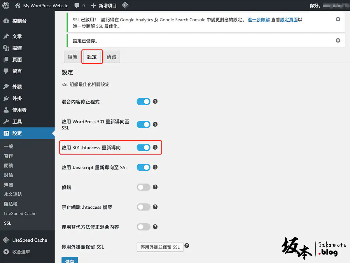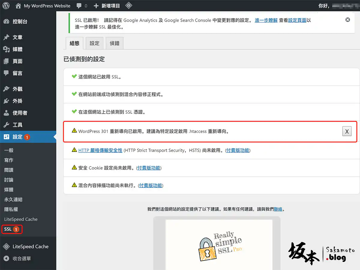 登入完後,去 SSL 頁面裡看到 WordPress 301 還沒有設導向,其它功能是付費版功能,所以不做介紹操作了。