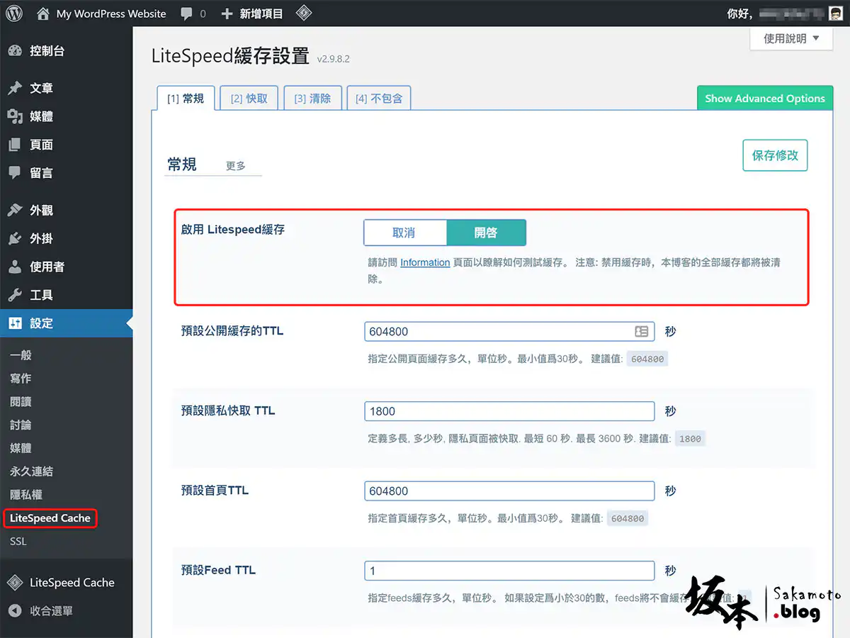 最後,再回到 LiteSpeed Cache 頁面裡,把它 開啟 完成了快取動作囉~