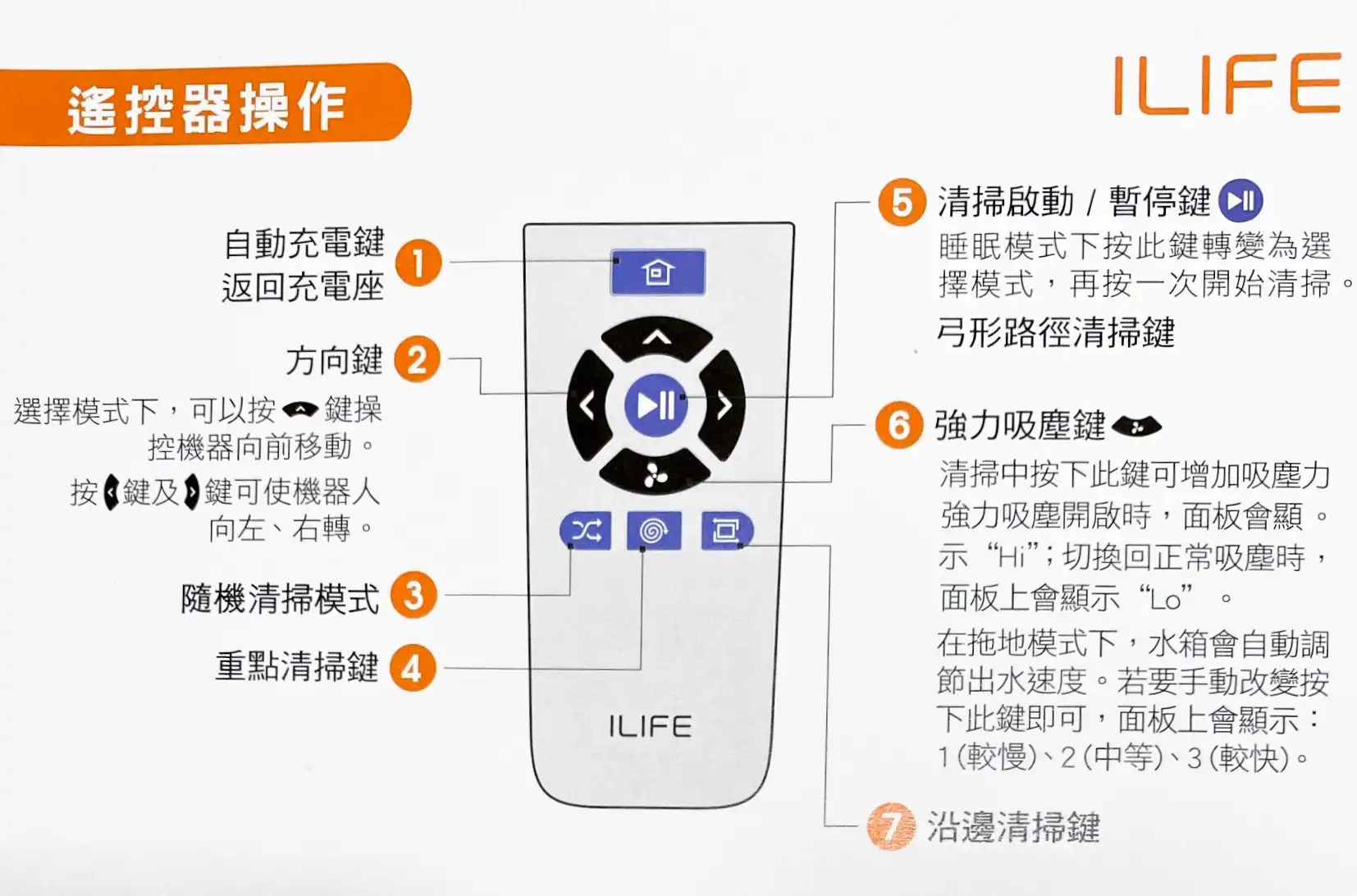 「吸地」用的是集塵箱,搖控器按鍵6可以讓機器人增加吸塵力。按此鍵可以注意機器人面板,出現 Hi 表示強力吸塵開啟,出現 Lo 切回正常吸塵。