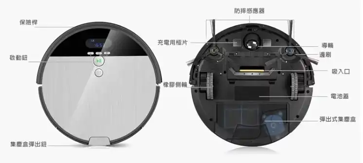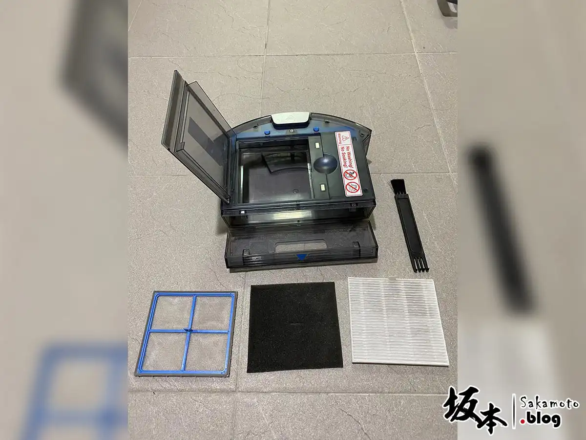 集塵箱已經先安裝在機器人本體上了,拆卸相當方便,尾端部分有一個彈出按鈕,按壓後往外抽出即可。V8S的容量是「750ml」,上蓋打開就可以換過濾器。