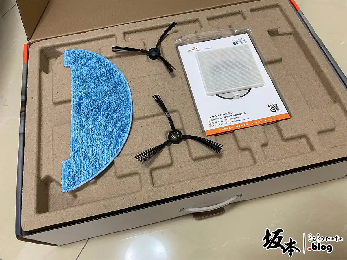 - 基本耗材:高效過濾器x1、拖地抹布x1、邊刷x1(和說明書一起放在第一層)