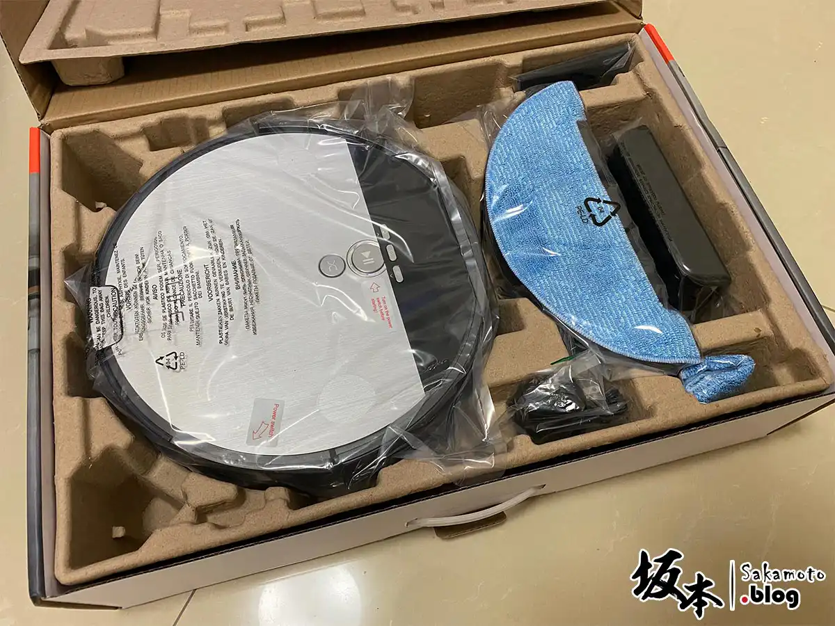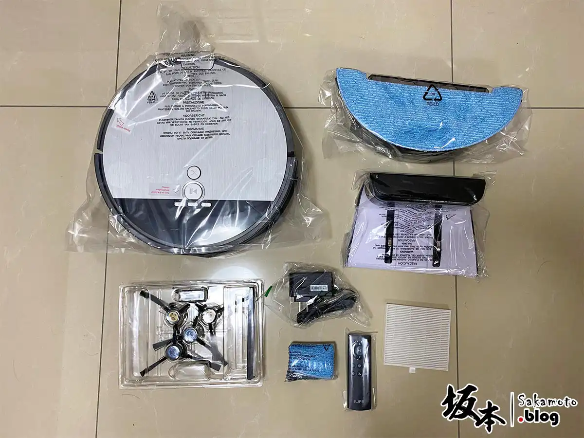 機器人本機x1、水箱x1、充電座x1、集塵箱x1(已經安裝在機器人上面)、遙控x1、充電線x1