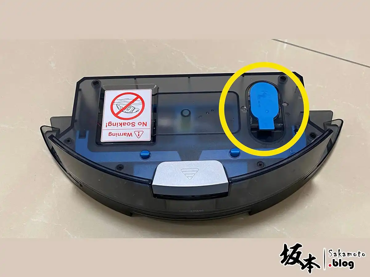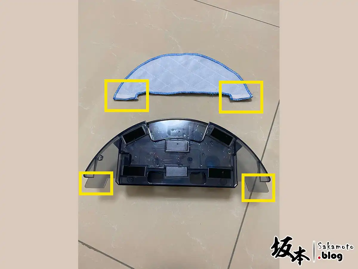 水箱「抹布」主要是用魔鬼沾黏著,它還有小貼心的地方,就是黃色圈起來的部份,抹布旁有鬆緊帶,可以箍住水箱旁的小耳朵。這樣機器人行進中,不容易掉下來了。水箱容量:300ml。