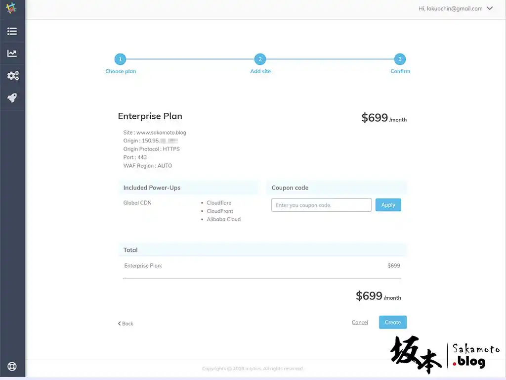 輸入網站資料後,下一步是會跟您確認方案資費以及資料是否有誤,若沒問題就可點擊 Create 付款並且建立動作。