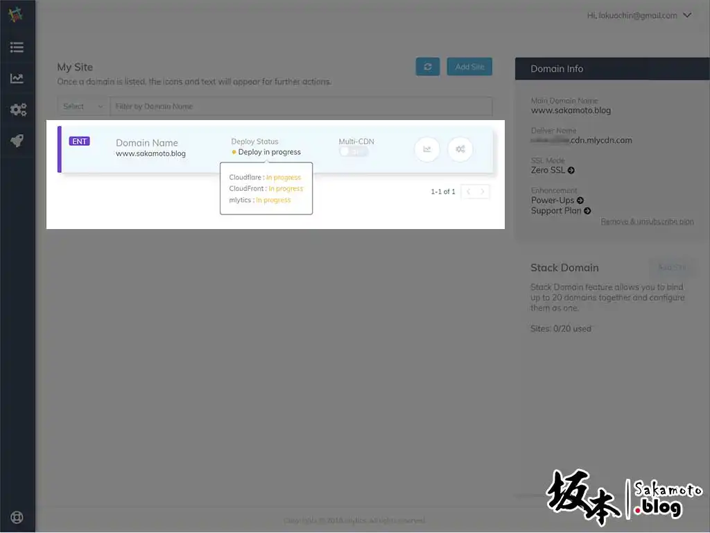 您可以看到您的網站已建立在清單了,在 Deploy Status 狀態顯示是 In progress 狀態,表示是各家 CDN 正在部署中,需要一點時間完成部署動作。