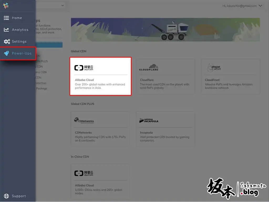在左側選單,選擇 Power-Ups 進入 Global CDN 清單,選擇 阿里云aliyun CDN 服務,因為是免費加值服務。