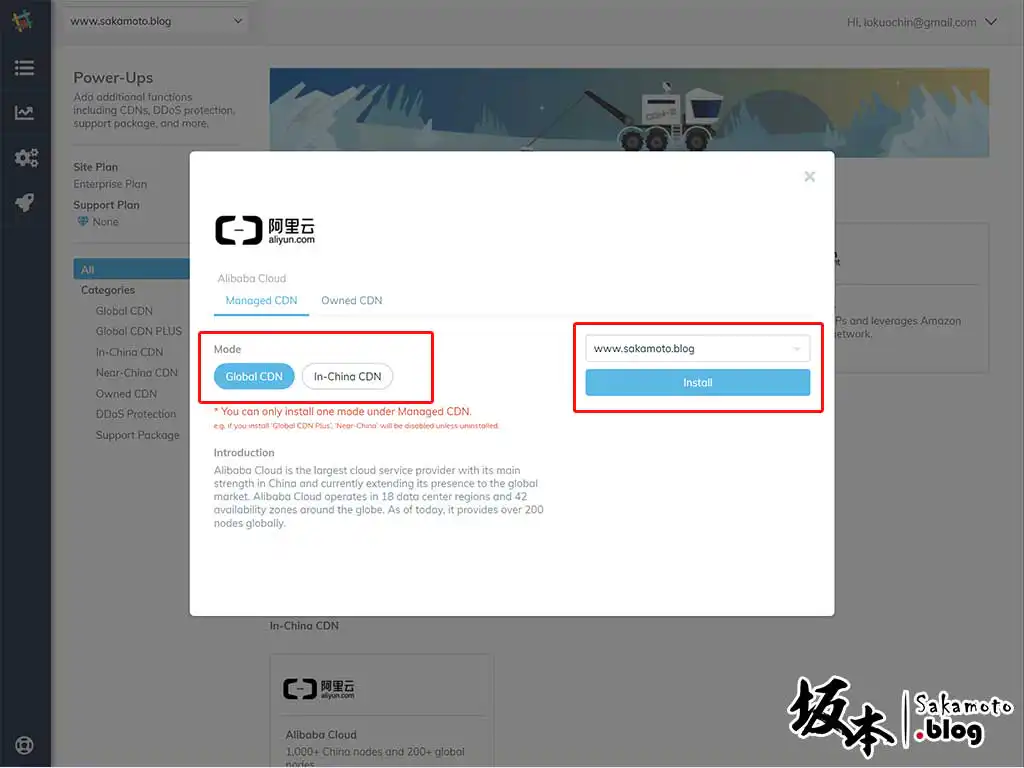 會有看到二種選項,分別為 Global CDN、In-China CDN,至於 In-China CDN 是需要 ICP 備案才能使用,也需要額外的加值服務跟流量費用,所以選擇海外站的 Global CDN ,在右側下拉式選擇網域要加值服務,再按 Install 就完成加值服務囉。