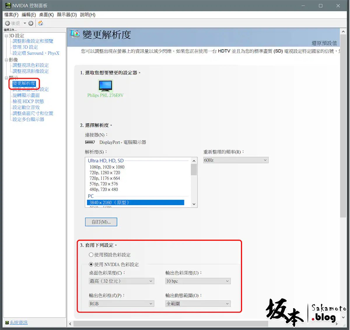 若要 10bit (位元) 深色的話,僅用 DisplayPort 1.4 規格支援,至於 HDMI 2.0 頻寬不足,只能用 8bit (位元) 深色;假如你是 DisplayPort 1.4 規格的話,以下為 NVIDIA 操作要改手動設定即可生效。