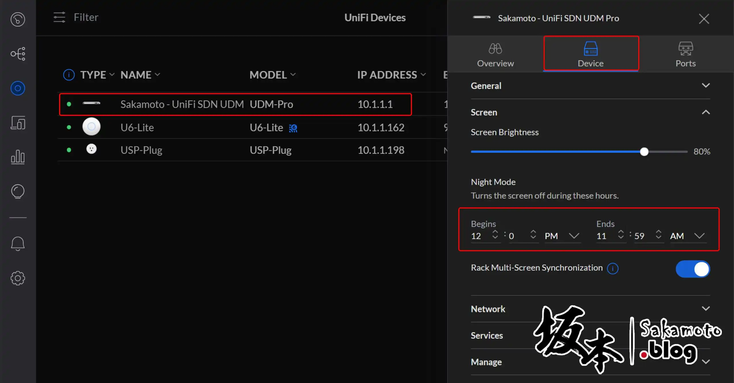 以下為 1.9.1 操作為例,在 UniFi Devices 裡列表,點選 UDM Pro 會跳出右側視窗,然後點 Device 頁面,在 Screen 地方,把 Night Mode 調整時間期間何時會關閉就可以了。