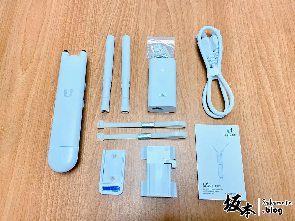 分別為 UniFi AC Mesh 本體、天線、PoE 供電、電源線、掛壁式工具、以及說明書。(不含網路線)