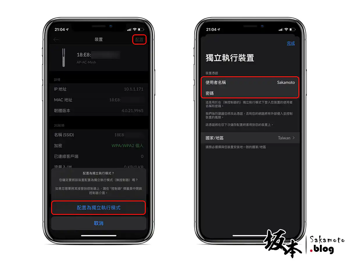 連線後,在右上角點 配置 → 配置為獨立執行模式 進入,設定裝置後台帳號密碼。