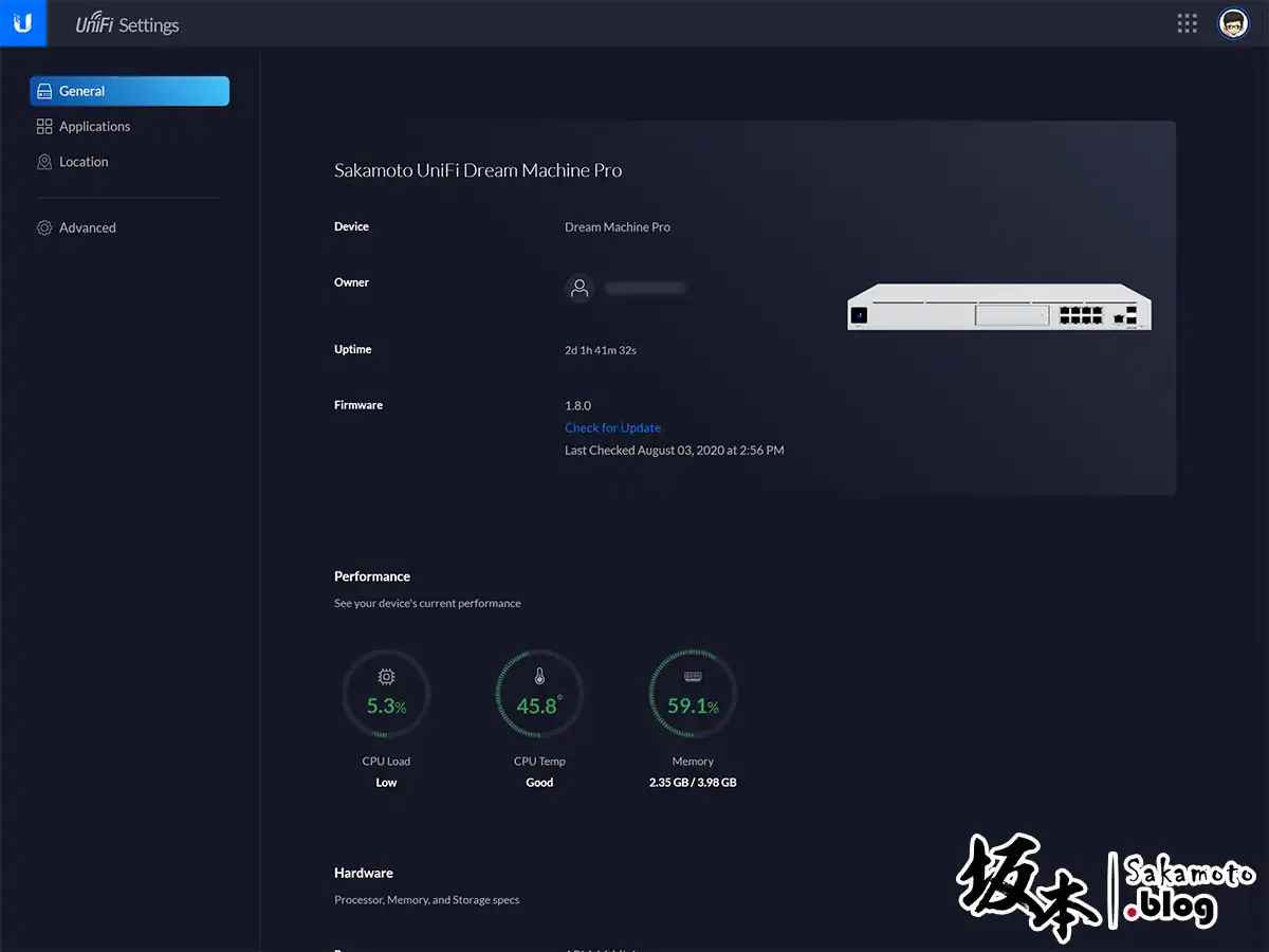 UDM Pro 詳細狀態裡面,會有顯示設備名稱、UI管理者連動帳號名字、持續運作時間、固件版本號、以及資源使用狀態。