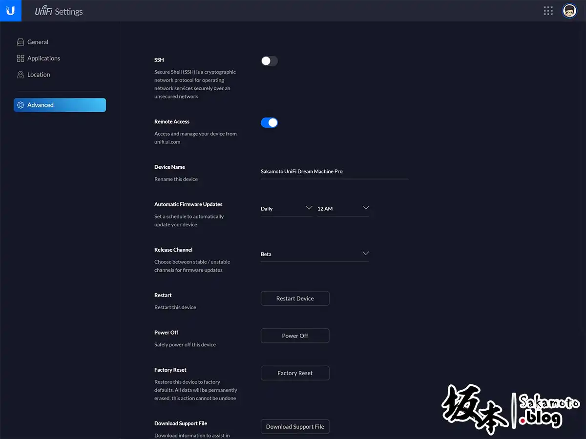 再來進階設定,有提供可開關 SSH 設置密碼,是否要開啟遠端連線 ( https://unifi.ui.com ),自訂設備名稱,自設自動更新時間,可選擇正式版/測試版固件更新,還有重新開機、安全關機、初始化設定值。
