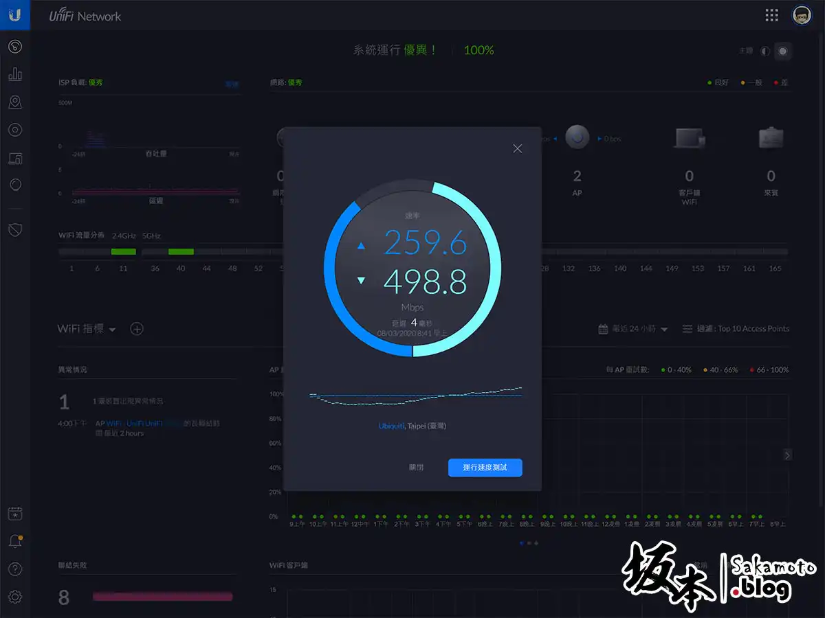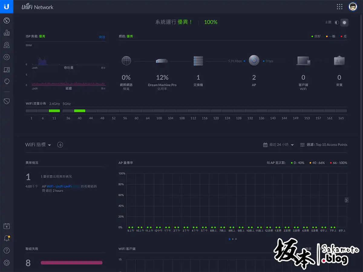 網路控制器主頁,很完整顯示目前的網路狀態如何呢,有異常狀況通知顯示在列表。