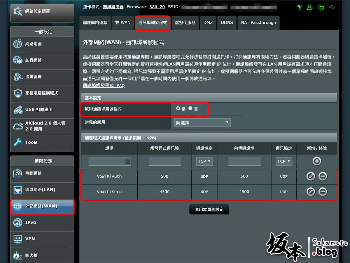 - 步驟一: 在 外部網路(WAN) → 通訊埠觸發程式 頁面