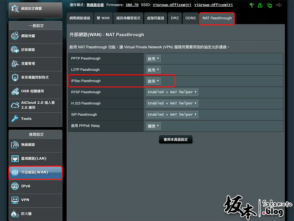 在 NAT Passthrough → IPSec Passthrough 選擇啓用並且套用