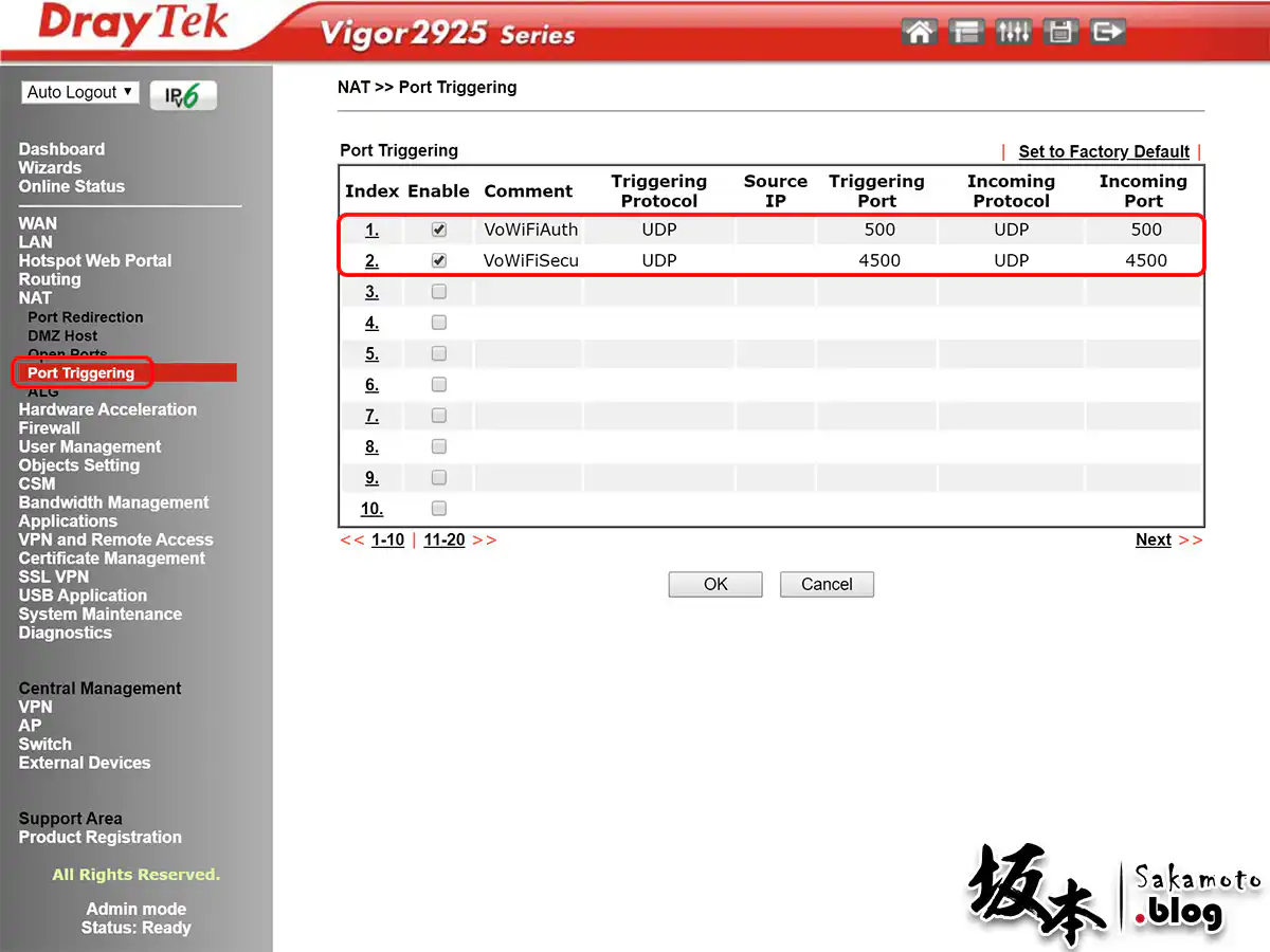 在 NAT → Port Triggering 頁面,加入 UDP 500、4500 Port 並且套用